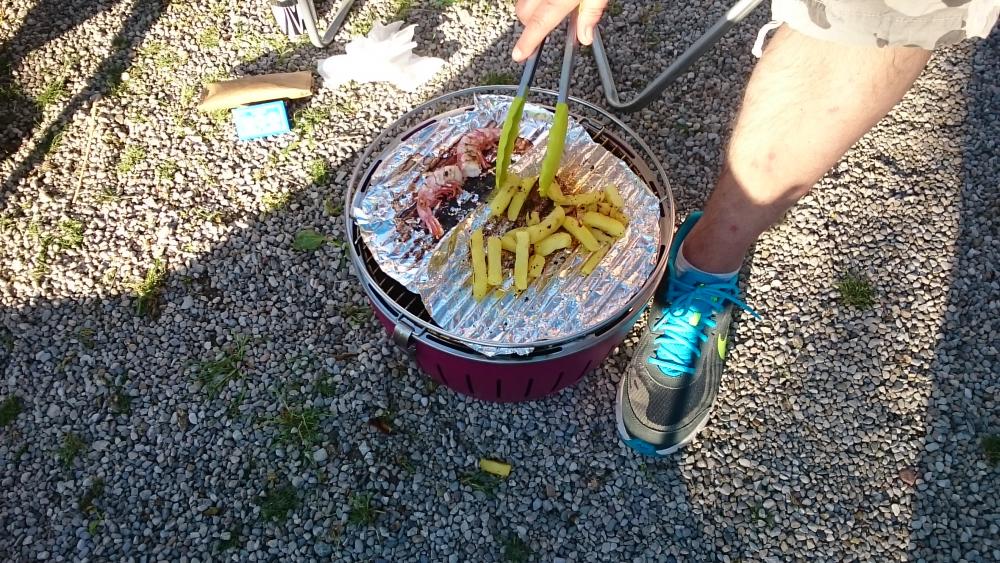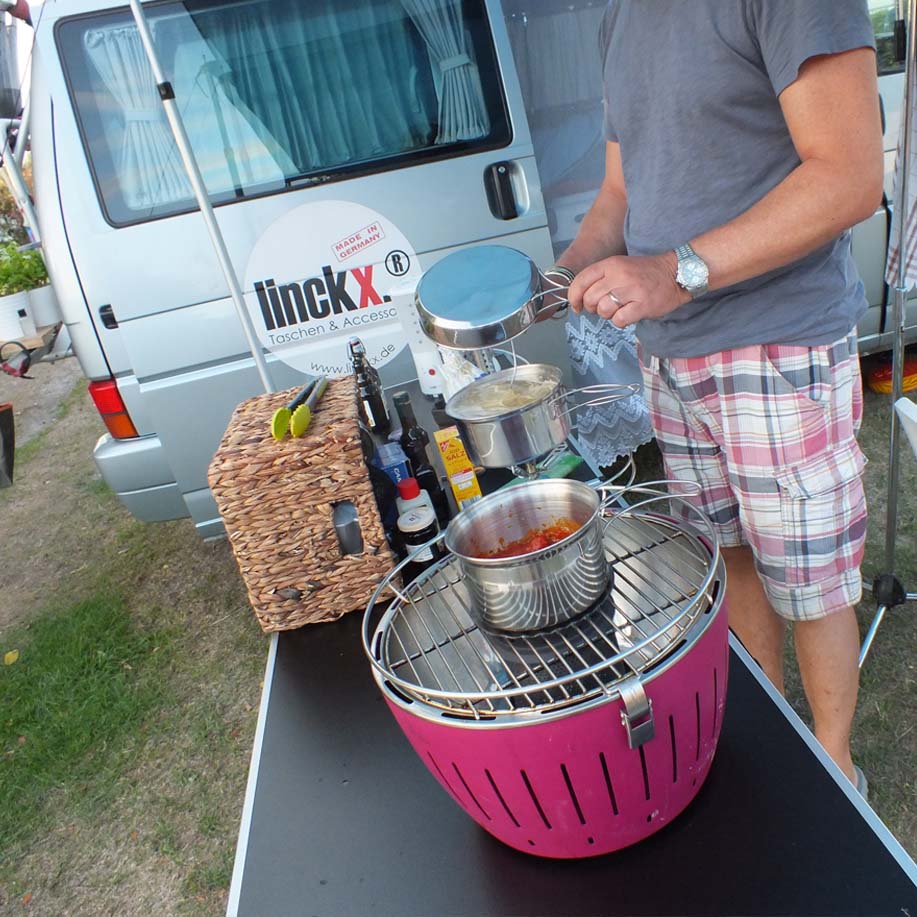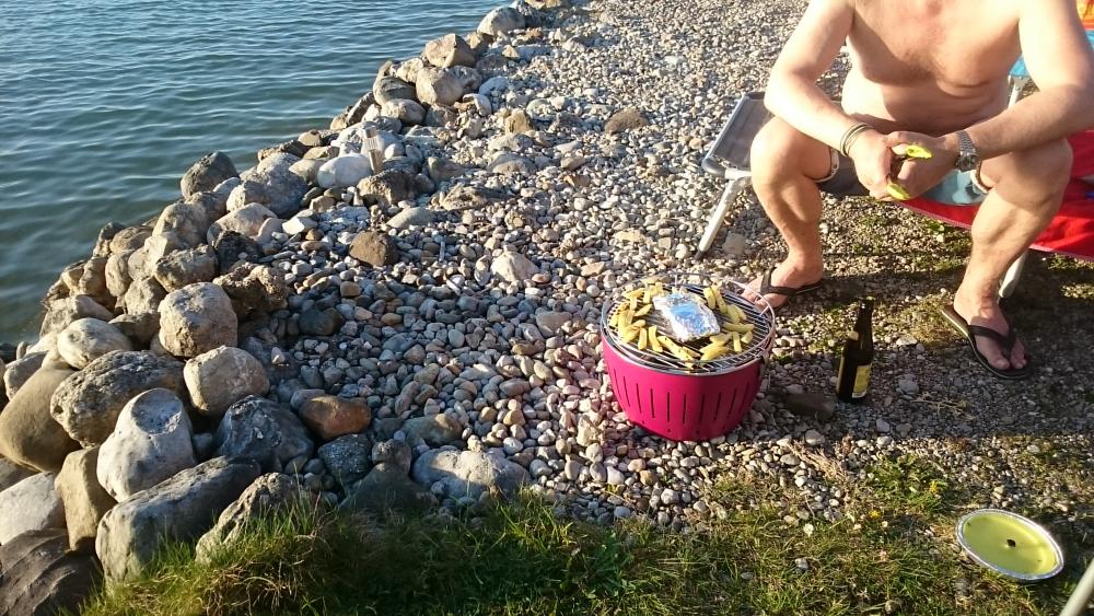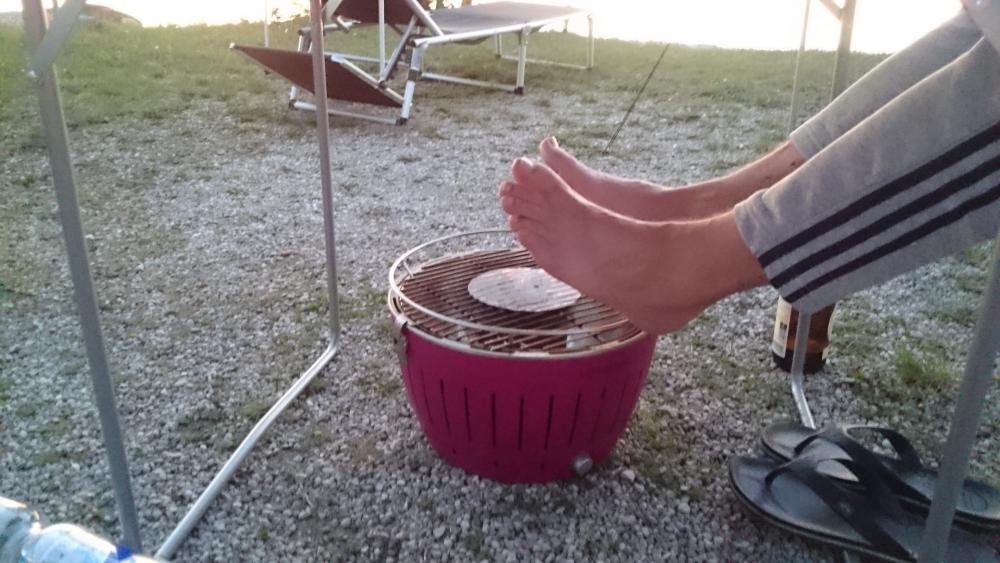Der Lotus-Grill wärmt uns nach dem Essen die Füße (nach dem Sonnenuntergang wirds schon etwas schattig um diese Jahreszeit – Mitte Mai…). Einfach nach dem Grillen nochmal Kohle nachlegen und den Grill unter den Tisch stellen.