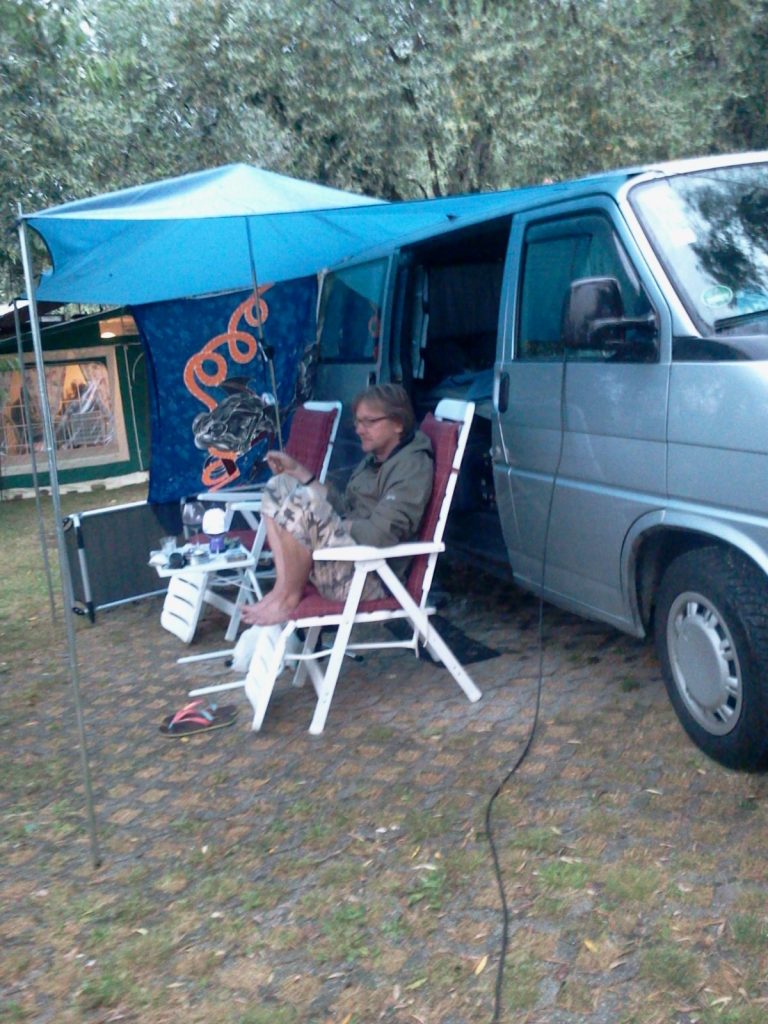 Dadurch können wir auch zwei zusätzliche Zeltstangen aufstellen, wodurch das Vordach alleine steht, so dass wir mit dem Bulli auch mal wegfahren können.